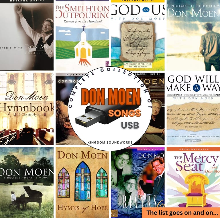 The Don Moen's Greatest Songs USB Collection is a curated anthology of the most cherished works by renowned worship leader and songwriter Don Moen. Known for his timeless and heartfelt worship anthems, this collection brings together his most impactful songs, including classics like "God Will Make a Way," "Give Thanks," and "I Offer My Life." Each track embodies Moen’s signature blend of profound lyrics and soothing melodies, designed to uplift and inspire personal devotion and collective worship. This USB collection serves as an essential resource for those seeking to deepen their spiritual experience through the music of one of contemporary Christian music’s most influential artists.
